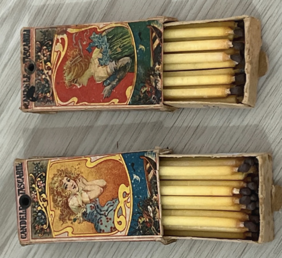 .Una tipologia molto particolare di fiammifero erano le candelette tascabili o “bugies de poche”. Queste candelette venivano accese di notte e inserite nel forellino presente sulla scatola e successivamente con la scatola in mano ci si faceva luce e si andavano ad accendere tutte le candele presenti sulle scale…infatti venivano chiamate anche Accendiscala. Si narrà tuttavia che in alcuni bordelli venissero usate per misurare il tempo di una prestazione…si accendeva la candeletta, la si metteva nel forellino e quando finiva indicava che il tempo di una prestazione era scaduto e doveva essere pagato. Sarà una storia vera?