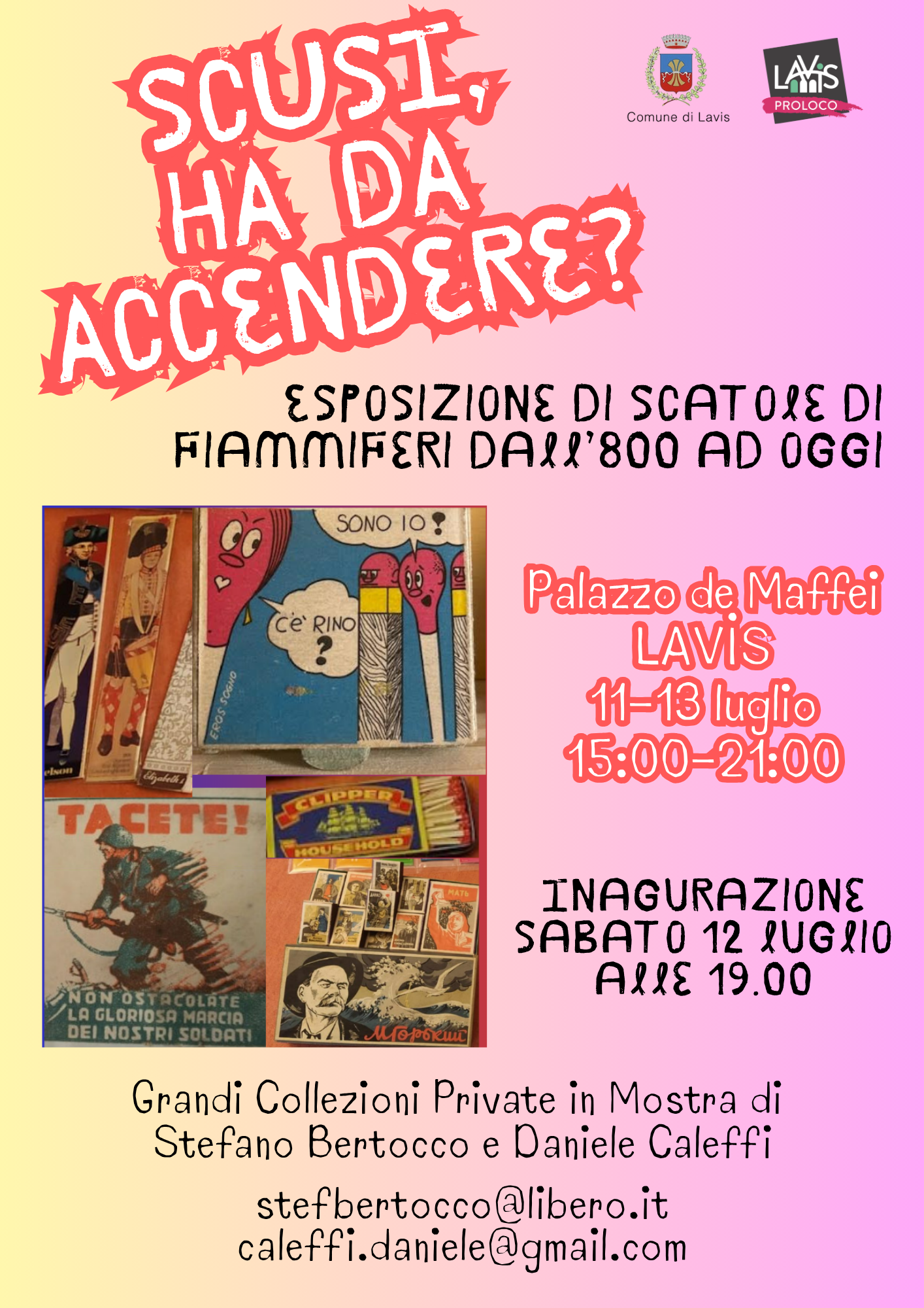 A Lavis (TN) presso Palazzo Maffei si terrà la mostra esposizione di scatole ed etichette di fiammiferi dall’800 ad oggi. Un viaggio nella storia e nella società italiana ed estera raccontato attraverso l’esposizione di materiale fillumenistico tratto dalle collezioni private di Daniele Caleffi e Stefano Bertocco.